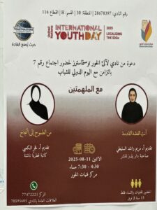بمناسبة يوم الشباب الدولي، نُظمت فعالية بالتعاون مع نادي لآلىء توستماستر، حيث شارك الشباب في لقاءات وحوارات ملهمة تهدف إلى إبراز دورهم في المجتمع وتنمية مهاراتهم القيادية والتواصلية. الفعالية ركزت على تعزيز الثقة بالنفس، تمكين الشباب من التعبير عن أفكارهم، وغرس قيم الإبداع والمبادرة في أجواء تفاعلية مليئة بالحماس.